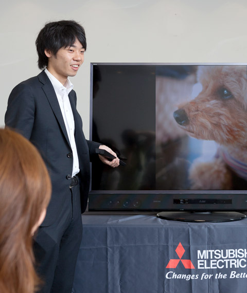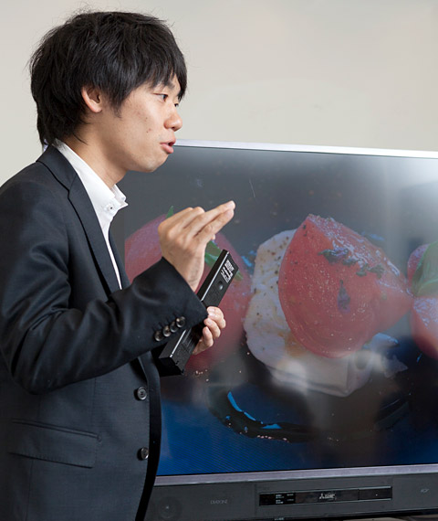 - いつもはパソコンの画面や紙にプリントして見ている写真。それを今日は編集部のみんなで一緒に大画面で鑑賞してみようということで、三菱の液晶テレビREALを用意し、部員が全員集合。さっそく、液晶テレビを製造している三菱電機京都製作所の對馬さんに使い方を教えていただきましょう。