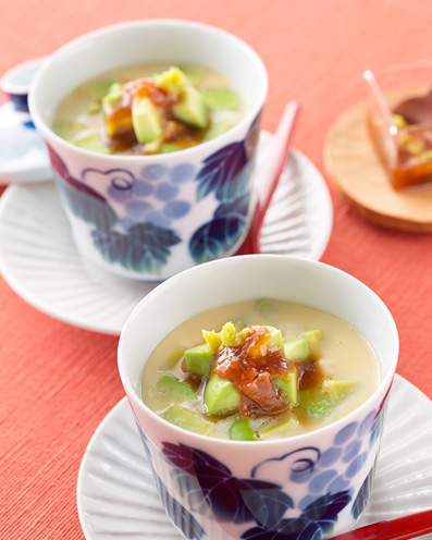 卵液と一緒に蒸し上げた後、さらに角切りのアボカドも梅干しと一緒にトッピングして、濃厚な味わいを楽しみます。