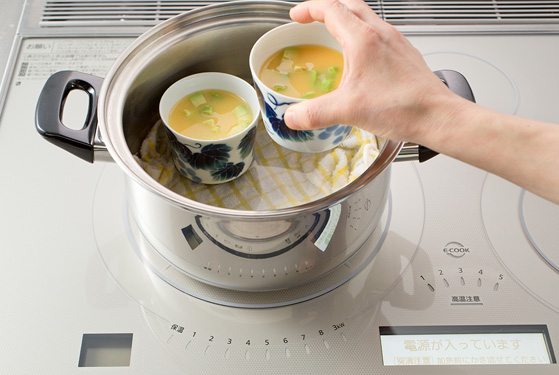 ⑦ 5〜6分でボコボコと湯の沸く音で沸騰したら、1〜2cmずらしてふたをかける。そのまま火力ランプ[5]で2〜3分を目安に沸騰を続ける。鍋のふたを開け、卵液の表面が白っぽくなっているのを確認する。