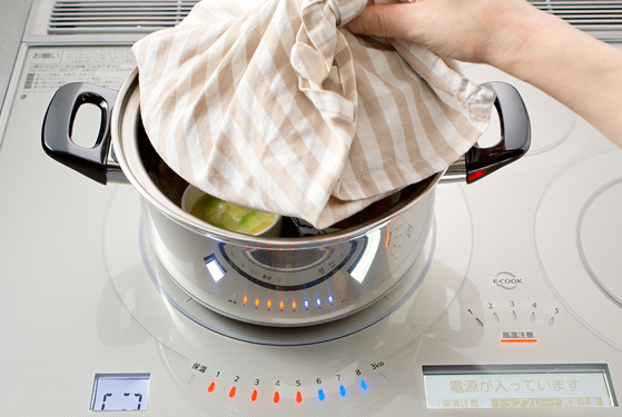 - ⑧ ふたをずらしてかけたまま、火力ランプ[2]で10分蒸す。器を揺らして、具材が動かなくなっていたら火を止める。