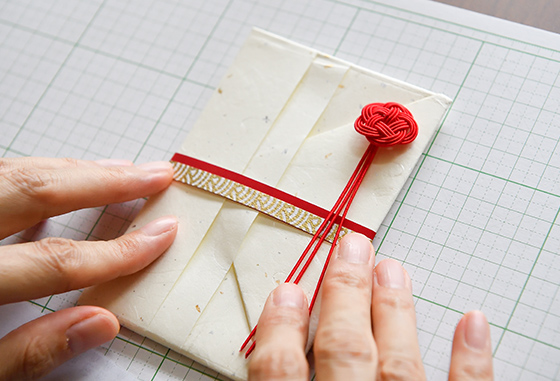 水引(みずひき)は、和紙をこより状にした飾り紐のこと。蝶結びや結び切りなど、TPOに合わせた形にしたら、折形に掛けて使います。水引には未開封を表す「封印」のほかにも、「魔よけ」や「縁結び」といった意味があり、贈答の折に華を添えてきました。