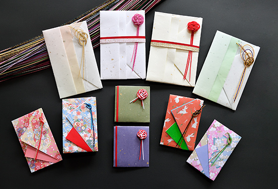 折形(おりがた)とは、和紙で物を包む礼法のこと。ご祝儀袋や不祝儀袋などに用いられ、古来より贈る相手の格にふさわしい和紙が使われています。