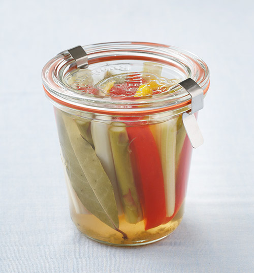 赤、緑、黄色のそれぞれの野菜の色どりを考えながらひとつひとつ瓶に詰めていくのも、瓶詰め作りの楽しみのひとつです。