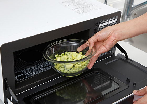 みんなで協力して取り出した豆をボウルに入れ、電子レンジで加熱!