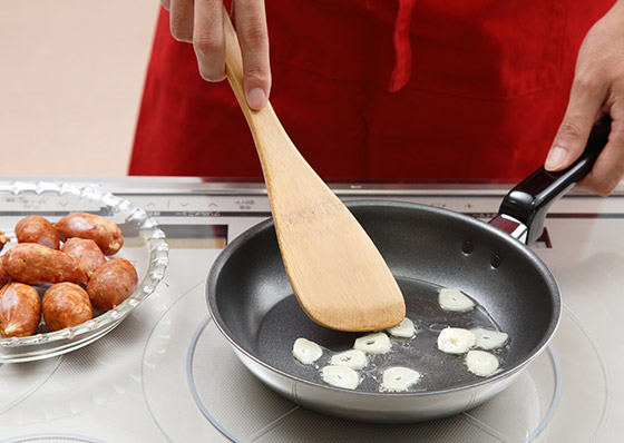 最初に油でにんにくを炒めて香りを出し、その油でソーセージとマッシュルームを順に炒めます。