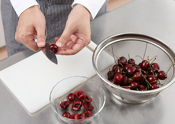 大粒のアメリカンチェリーのヘタを取り、実を半割にして種を取り除くところから、作業スタート。赤ワイン仕立ての“大人のデザート”にする予定です。