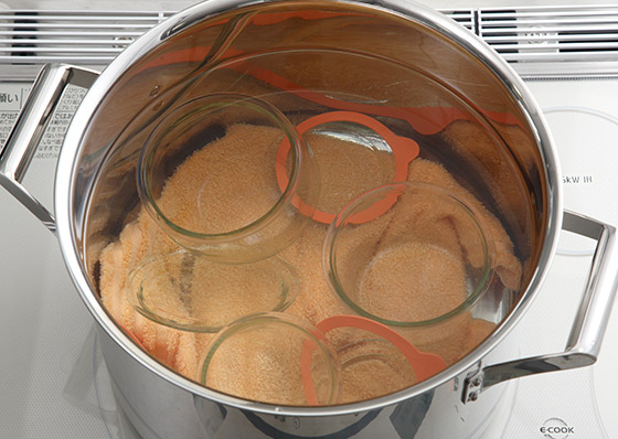 瓶に食材を詰める前に忘れてならないのが、煮沸消毒。鍋底に厚手の布かタオルを敷き、瓶とフタ、ゴムパッキンをすべて鍋に入れて水を注ぎ、沸騰させます。沸騰した後、約5分加熱。このひと手間でしっかり雑菌を抑えることが、瓶詰め保存食の基本です。
