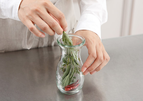 自宅でもハーブを育てている編集部員Oは、「ハーブオイル」作りをチョイス。赤唐辛子やローズマリー、セージ、オレガノなどのハーブをていねいに詰めていきます。このとき、丁寧に洗ったハーブ類はしっかり乾かし、食材がすべてかぶる量の油を注ぐことで、菌の侵入を防ぎます。