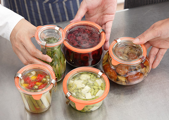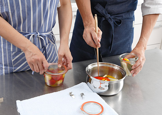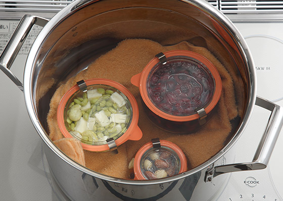 瓶に食材を詰め終わったら、ゴムパッキンを挟んでしっかりフタをし、今度は密閉煮沸を行います。鍋底に布を敷いた上に瓶詰めを入れ、瓶の上約5cmまでぬるま湯を注いで20〜30分ほど煮沸(加熱時間は食材ごとに異なります)。これで瓶がほぼ真空状態となり、長期保存ができるというわけです。