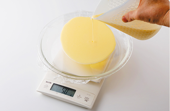 電子レンジ加熱は、重量が変わると火の通り加減も変わります。ピンと張ったラップの上に重さを量りながら生地を流しましょう。