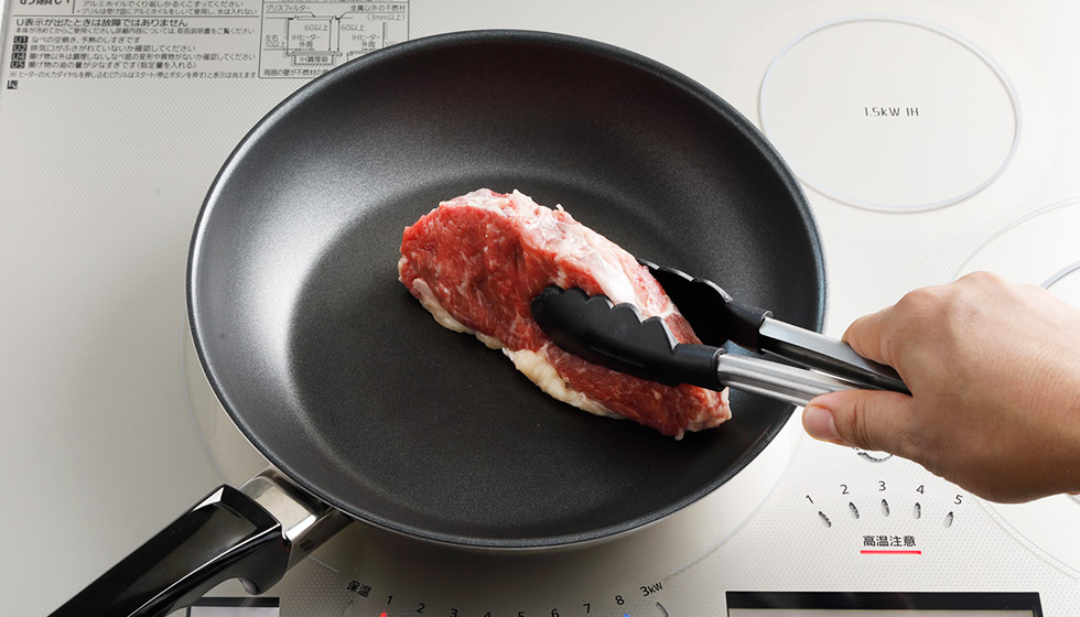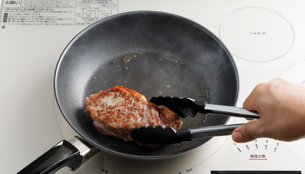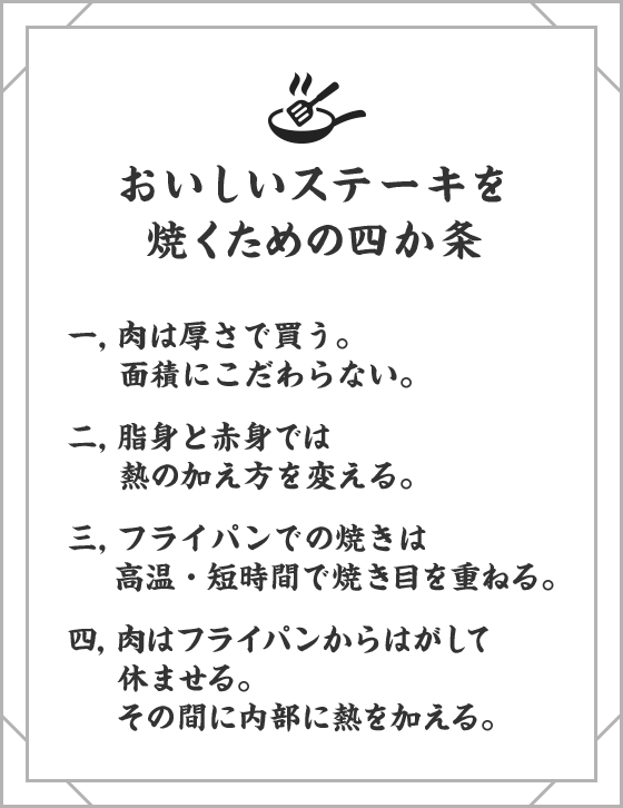 「それはスーパーなど売る側の理屈です(笑)。料理する人がコントロールできるおいしさは面積ではなく、厚さに由来します。『表面積が大きいステーキ』より『分厚いステーキ』のほうがおいしく焼きやすい。目安の厚さは最低2cm、3cmくらいあってもいい。一般にスーパーで売っている厚さ1cmくらいの"ステーキ肉"はプロの肉焼きシェフでも難色を示す、難しい肉なのです」