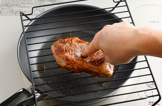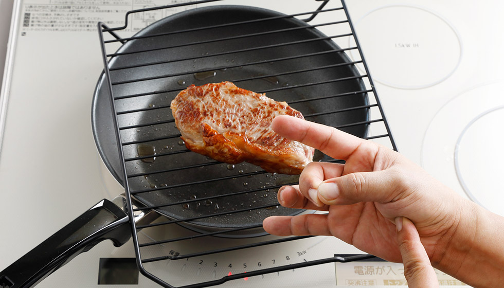 3.いったんスイッチを切り、魚焼きグリルの網などをフライパンに渡し、“温かい場所”を作って2分間肉を休ませる。