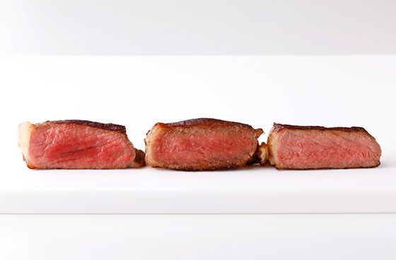 2cmのステーキの断面。左から火入れ回数3回のレア、4回のミディアム・レア、5回のミディアム。