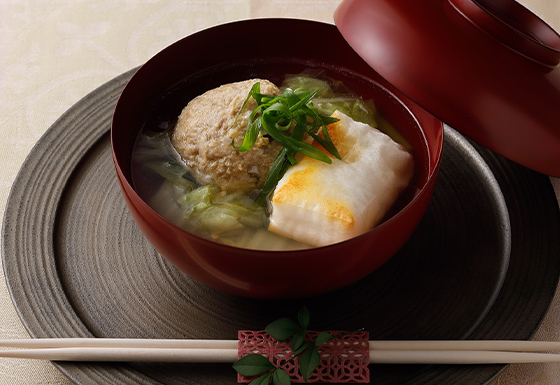 五香粉とザーサイ入りの肉団子、旬の甘い白菜を使ったあっさりとした中華スープのお雑煮。