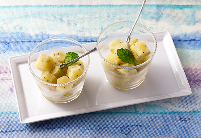 すりおろしたグリーンキウイと小さな角切りのゴールデンキウイを混ぜ合わせた、二つの異なる食感が楽しめるアイス。米麹の甘酒だけで作る優しい甘さは、ヘルシーでダイエット中の方にもおすすめです。今回はレモングラス入りのハーブティーを加えて、より爽やかで大人向きのデザートに仕上げました。