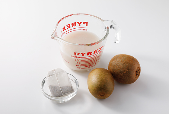 ボウルにグリーンキウイ、ゴールデンキウイ、米麹甘酒、冷ましたハーブティー大さじ3を入れてよく混ぜ合わせる。