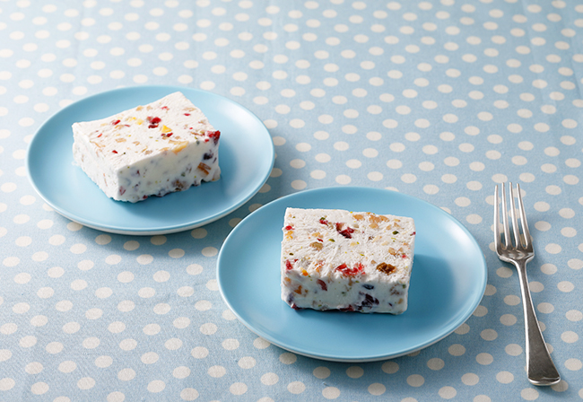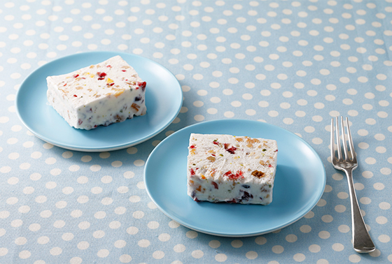 ドライフルーツとナッツをたっぷり使って宝石箱のようなアイスデザートを作りましょう。フワフワのメレンゲにプチプチ食感のイチジク、甘酸っぱいクランベリーや香り高く爽やかなオレンジピール、コクのあるローストくるみ…。色とりどりのリッチなおいしさは、おもてなしやバースデーケーキにもぴったりです。