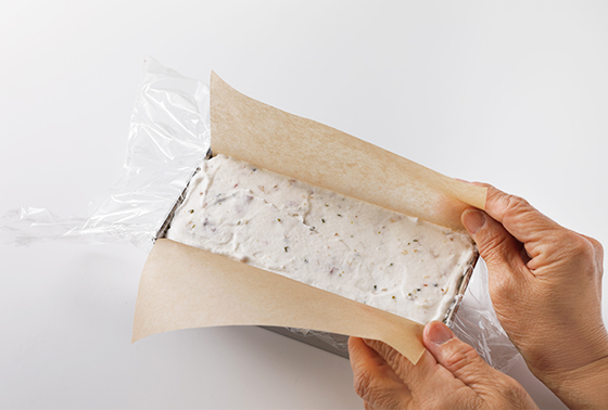 長めに切ったラップを型の内側に貼り付けるように敷き、オーブンシートをセットする。アイスベースを型の深さ半分ほど入れ、3cm位の高さから落として空気を抜き、残りのアイスベースも加えて表面を平らにする。オーブンシートでフタをしてラップで包み、冷凍庫で冷やし固める。