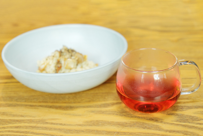 きのこのリゾットに合わせるのは「べにふうき」。インドが原産のダージリンと、和紅茶である「べにほまれ」とをかけ合わせた品種で、ふたつの茶葉の特徴を併せ持っています。ミルクティーにするとおいしいダージリンは、同じく乳製品であるチーズとも相性ぴったり。ハーブのような香りが旨味を補完するアクセントになり、その苦味は口の中でチーズと出会うとまろやかな味わいに変化します。こうした「口内調味」もティーペアリングの面白さのひとつです。一方、べにほまれは日本茶を発酵して作られており、日本人の舌にもなじみやすいのが特徴です。蜜のようなほのかな香りや根菜を思わせるコクが、きのこの土っぽさと同調して滋味深い味わいに。赤い色合いが美しいべにふうき茶とともに、秋の深まりを感じられるペアリングです。