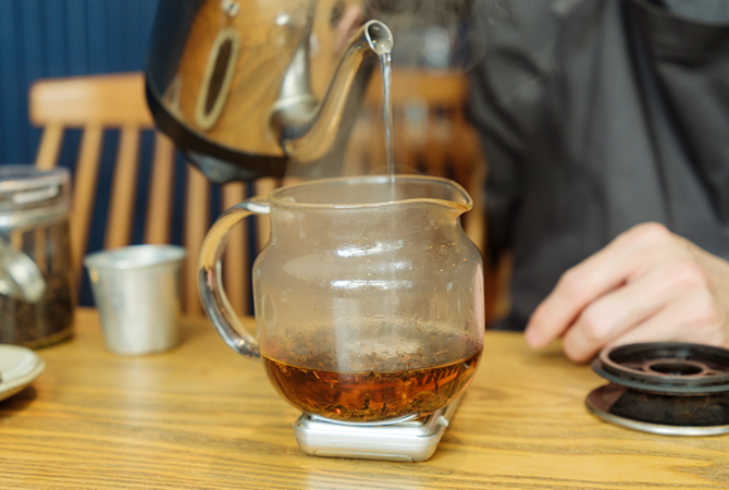 150mlのお湯に対して、茶葉を2gほど使います。お湯を沸かしたら30秒ほど置き、90度くらいになるまで冷ましましょう。ボコボコという沸騰の泡が落ち着く頃が目安です。茶葉を入れたティーポットに注いで2分ほど蒸らしたらでき上がり。茶葉の量が多すぎたり、蒸らす時間が長すぎると、タンニンが出すぎて渋みが強くなるので注意しましょう。