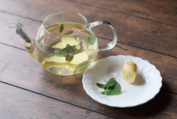 - 1.温めたポットにセージと生姜を入れる