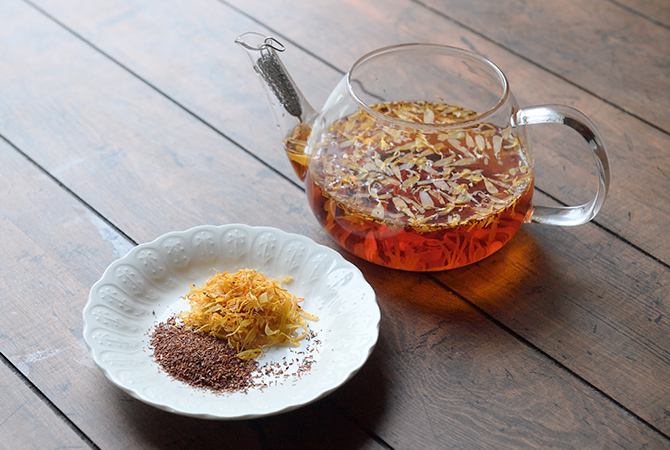 - 1.温めたポットに、ルイボスティーの茶葉とドライマリーゴールドを入れる