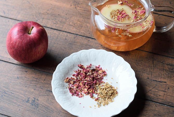 - 1.温めたポットにりんごとエルダーフラワー、ドライローズレッドを入れる