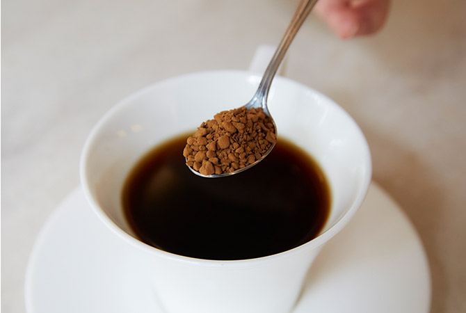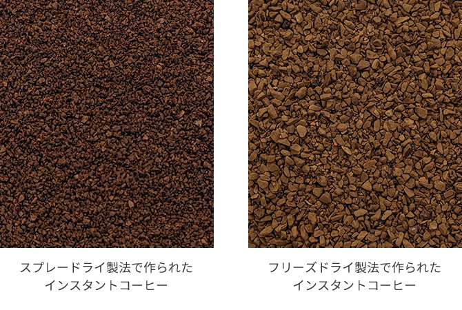 インスタントコーヒーにはさらさらとした粉状のものと、もう少し大きめの粒状のもの、ふたつのタイプがあります。この違いを生むのが製法です。高温の熱風を吹きつけて水蒸気になったコーヒー液を瞬時に乾燥させる「スプレードライ製法」で作ると粉状に。細かいのでお湯やミルクなどに溶けやすいのが特徴です。一方、コーヒー液を超低温で冷却し、水分を取り除く「フリーズドライ製法」だと粒状に。スプレードライ製法に比べてコーヒー本来の風味や香りが失われにくい良さがあります。