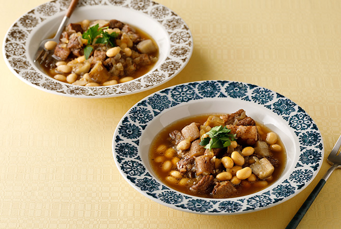 鍋にオリーブ油小さじ1を熱してニンニク、タマネギを炒め、しんなりとしてきたらゴボウを加えて炒め合わせる。豚肉、水を加えてひと煮立ちさせ、アクをとり除いて白ワイン、赤唐辛子、ローリエを加え混ぜ、フタをして弱火で30分煮る。フタをとり除いて大豆を加え、弱めの中火で10分ほど煮て、調味料を加えて味を調える。