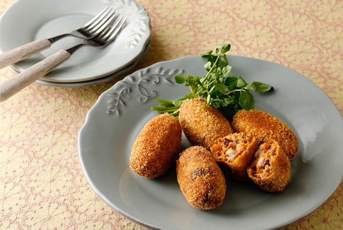 ・コロッケのタネが手にべたつく場合は、6等分して軽く丸め、表面に小麦粉を茶漉しでまんべんなくふってからラグビーボウル状に形作るとよいです。