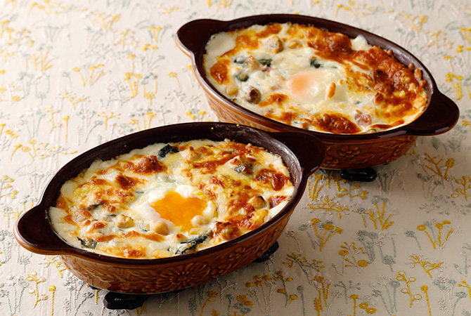 耐熱容器にグラタンソースを入れ、中心部分を少しへこませて温泉卵を割り入れ、ピザ用チーズを散らす。オーブンに入れ、こんがりと焼き色がつくまで10分ほど焼く。
