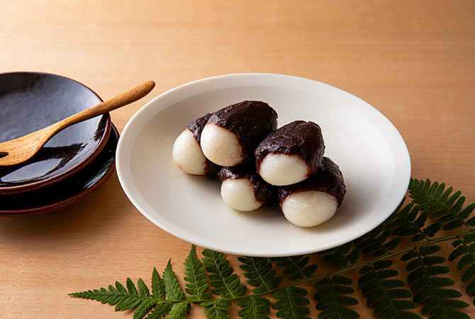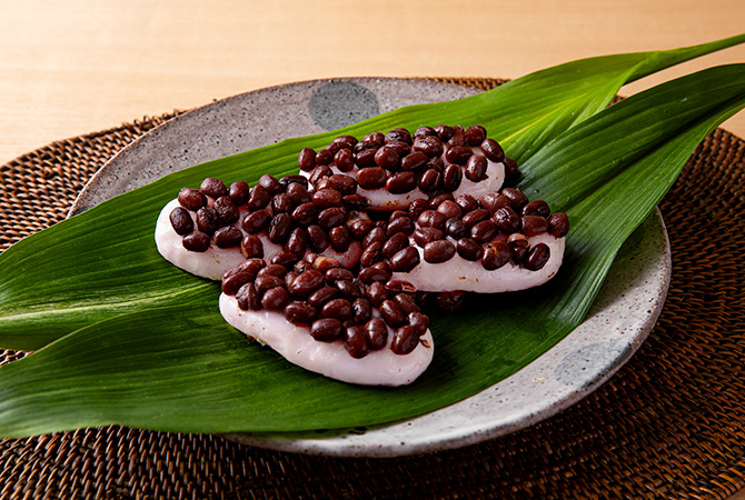 もちが温かいうちにゆで小豆をまぶしつけ、器に盛る。