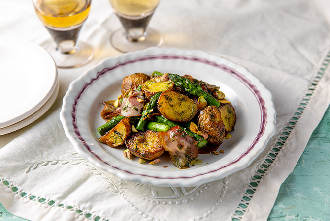 オーブンで焼いた新ジャガイモにベーコンと茹でたアスパラガスを加えて作る食べ応えのあるホットサラダです。
