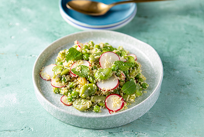 ふんわり柔らかなクスクスに、旬のソラ豆とグリーンピースのやさしくほくほくとした甘みとミントの清涼感の絶妙なバランスの一皿。