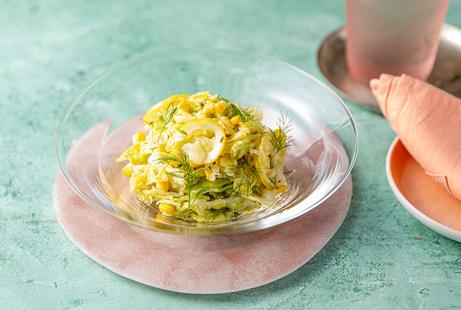 水分が多く葉が柔らかで甘みがある春キャベツをコーンとあわせてつくる、レモンとハーブの香りが爽やかなコールスローです。