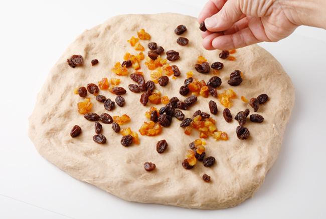 発酵した生地をこぶしで軽く押してガス抜きをし、台にとり出す。指先で押しながら広げて(C)を散らし、全体が混ざるようにこねる。
