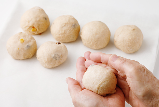 棒状に伸ばして12等分に分割し、表面が滑らかになるようにまるめる。オーブンシートを敷いた付属の角皿に1~2cmくらい間隔をあけて並べ、ぬれ布巾をかけて再び30分ほど発酵させる。