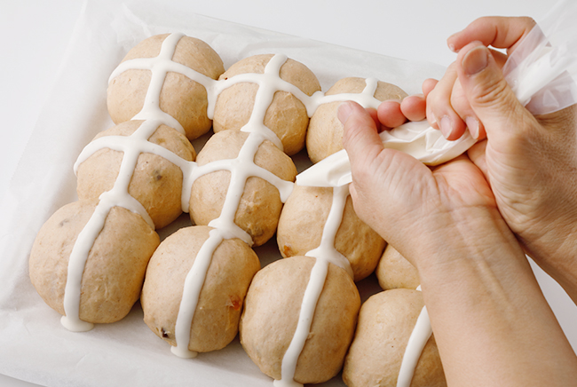 パン生地にクロス部分の生地を十文字に絞り出す。