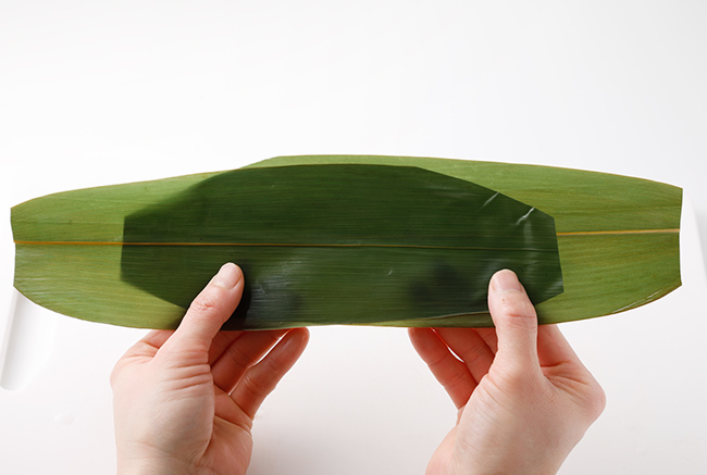 ※笹の葉はよく洗い、使うまで水に浸しておく。表側のツルツルした方を内側にすると、でき上がりで、葉に米がつきにくくなる。