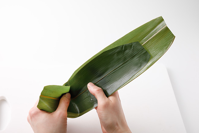 ③-6笹の葉の余っている部分でふたをするように包み、形を整える。