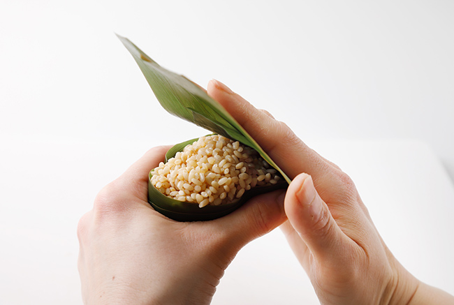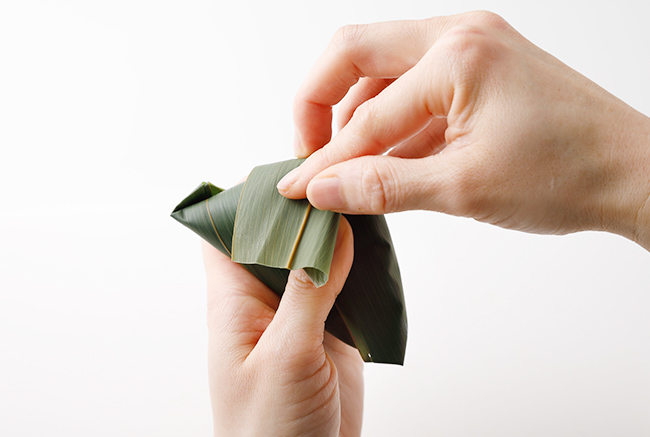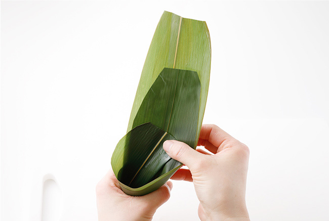 ※笹の葉を円錐のカップ状に折る際は隙間ができないよう、ぴっちり合わせる。