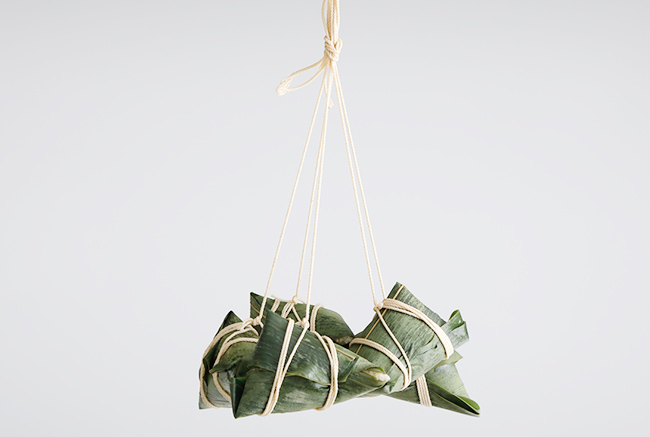 笹の葉でうつわを作り、もち米、甘栗、豚肉、鹹蛋を入れて、葉の上からタコ糸で縛る。10個巻き上げたら、5個ずつまとめて束にする。