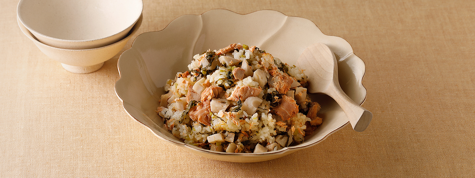炊く- 炊飯器に野沢菜漬け、レンコンを広げ入れ、鮭をのせ、【お米/白米】【炊き方/おこわ】にして炊く。鮭の皮と骨をとり除いて粗くほぐし、全体をさっくりと混ぜ合わせる。