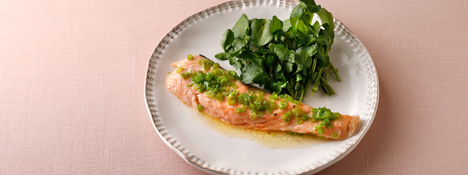 蒸す- 耐熱容器にサーモンの皮目を下にして並べ入れ、白ワインをまわしかける。クレソンバターを等分してサーモンにのせ、ふわりとラップをして【レンジ】【手動600W】で4~5分加熱する。