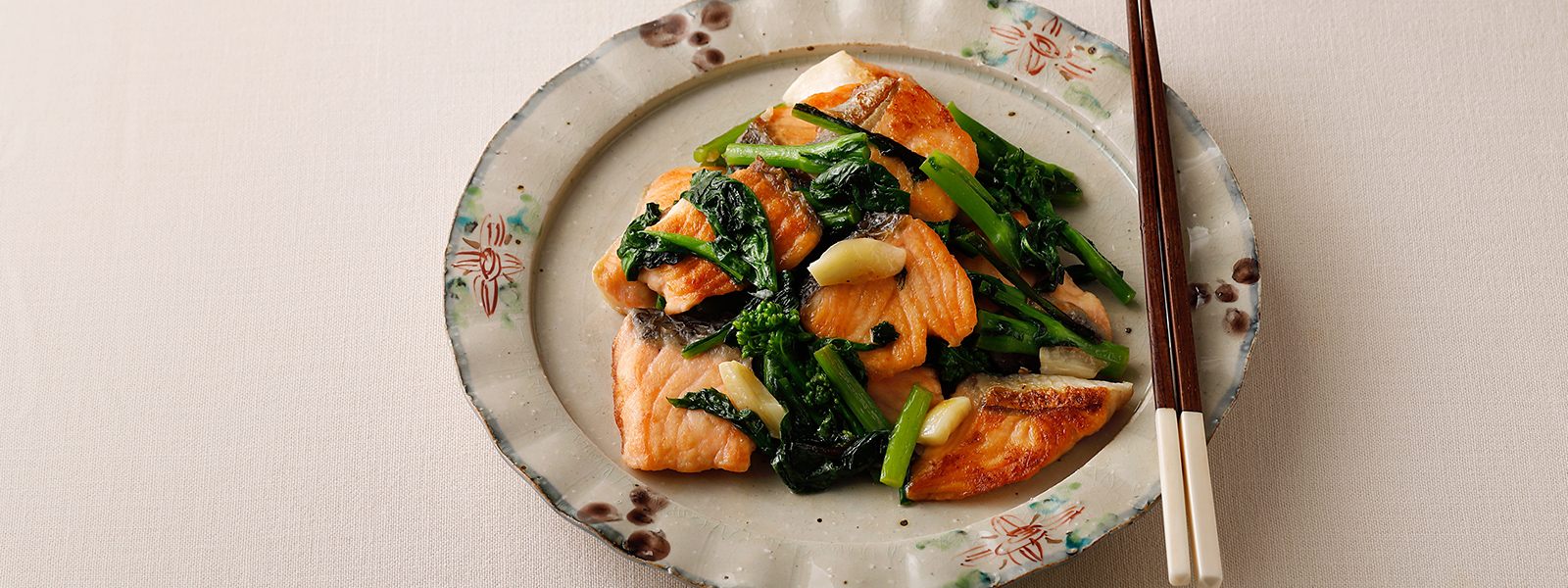 蓋をとり除き、残りの菜の花を加えて炒め合わせ、しんなりとしてきたらサーモンを戻し入れ、合わせ調味料を加えて手早く炒め合わせる。