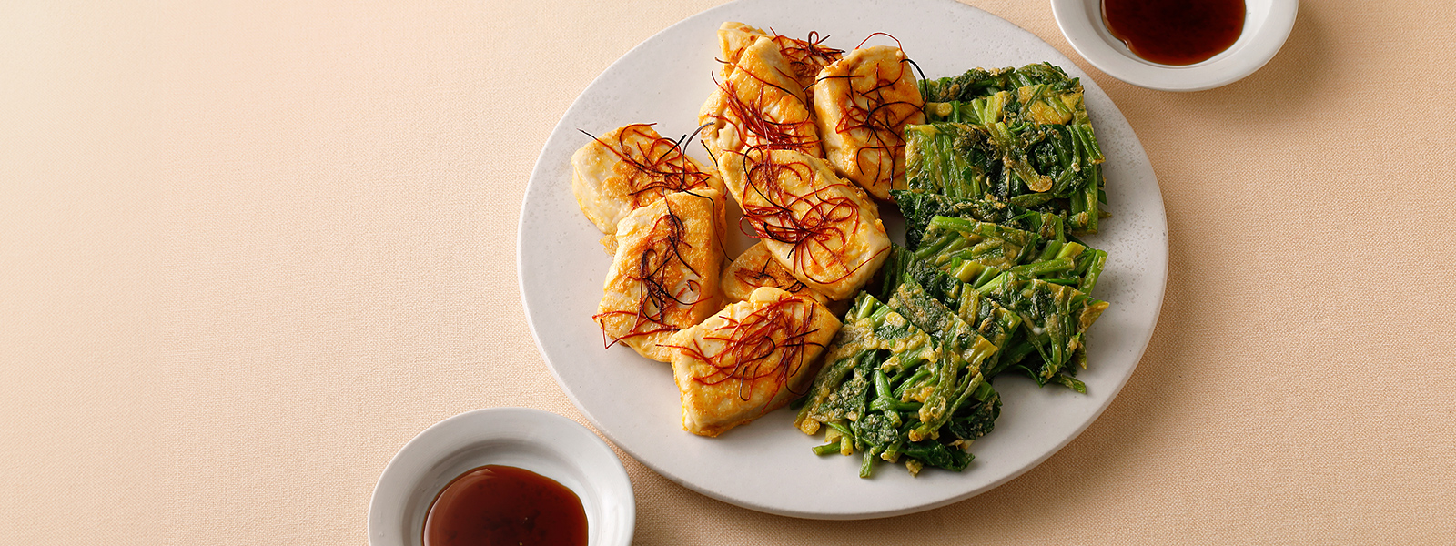 フライパンにゴマ油大さじ1/2を入れて【火力4~5】で加熱し、ビンチョウマグロを溶き卵にさっとくぐらせて並べ入れ、糸唐辛子をのせる。薄く色づいたら裏返し、もう片面も薄く色づく程度に焼いてとり出す。