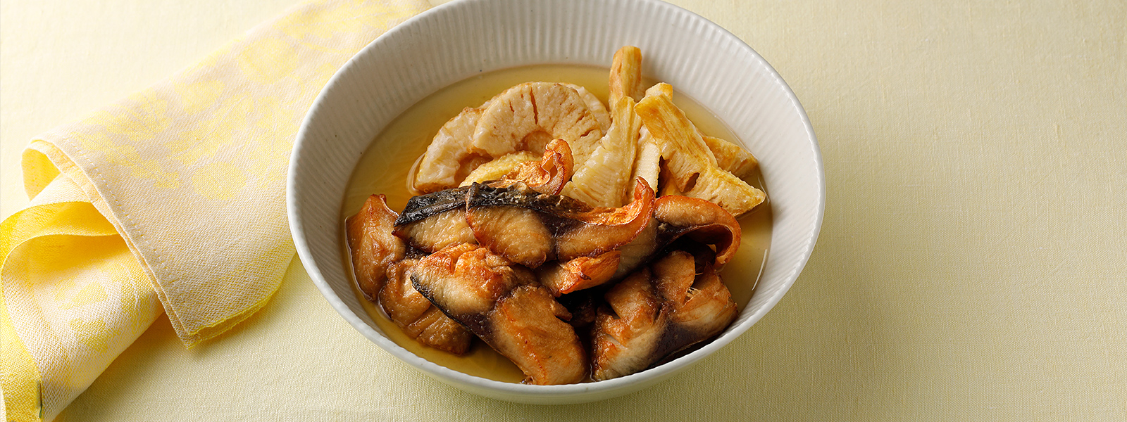 盛る- 器にサバとタケノコを盛り、だしつゆをまわしかける。