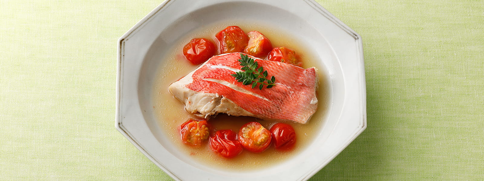 - 気温が高くなる季節には、あっさりとした煮魚がおすすめです。だしの味わいを活かして、甘みやしょうゆの風味は控えめにし、プチトマトの酸味とうま味を合わせました。
