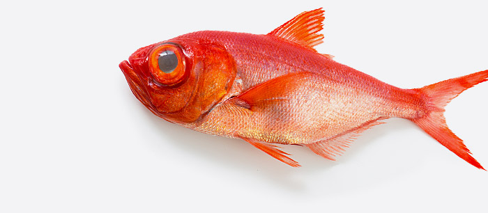 キンメダイは真っ赤な魚体と大きな目が特徴の深海魚です。魚の中では長寿で15年ほど生きる個体もあり、大きいものは体長50cmほどにもなります。私たちが店頭などで目にするキンメダイは真っ赤な体色が目を引きますが、赤く変化するのは漁獲後です。深海にいるときは、背は赤色で、腹は銀色をしています。このような、背と腹が異なる体色で周りの色に溶け込むような現象を「カウンターシェーディング」と呼びます。海で泳いでいる時の背側から見ると暗い深海に、腹側から見ると明るい光に溶け込んで見え、周囲の目を欺くのに役立ちます。