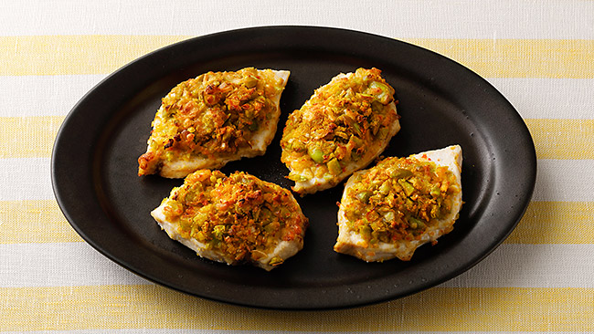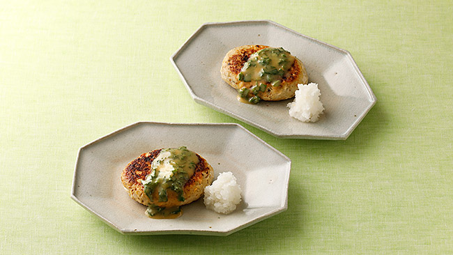 - アジはフードプロセッサーを使うことで、口あたりをなめらかにします。タケノコやタマネギは、食感のアクセントになるような大きさにカットして加えています。特製のみそソースにはみそと相性のよい青ジソを加え、さらに添えている大根おろしで味の変化も楽しめます。